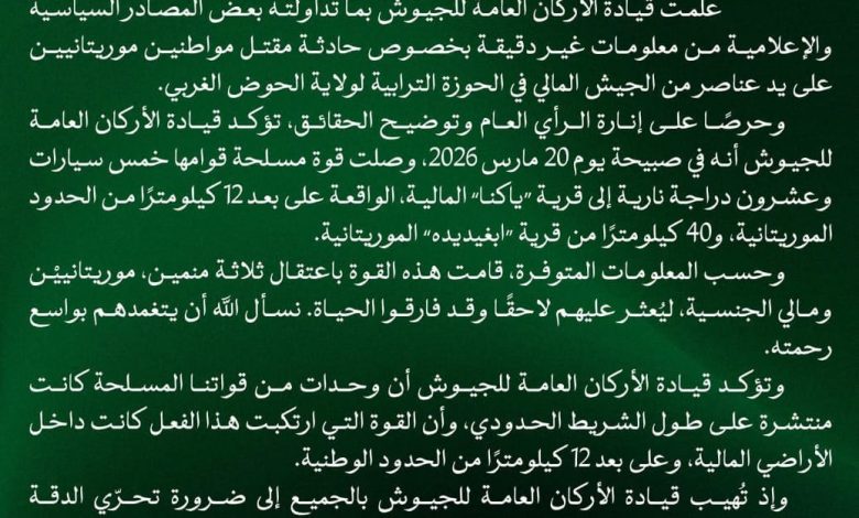 أكّد الجيش الموريتاني مقتل ثلاثة منمين بينهم مواطنان اثنان من موريتانيا داخل الأراضي المالية يوم الـ20 مارس الجاري.