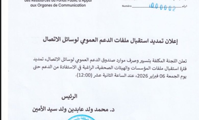 وأعلنت اللجنة أن تمديدها لفترة استقبال الملفات إلى غاية يوم الجمعة 06 فبراير 2026 عند الساعة الثانية عشرة زوالاً (12:00).