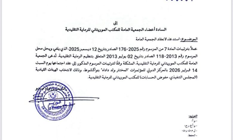 وحددت الوزارة وفق استدعاء صادر عنها اليوم موعد الجمعية العمومية بالسبت 14 فبراير الجاري، في المركز الدولي للمؤتمرات المختار ولد داداه.