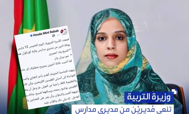 نعت وزيرة التربية وإصلاح النظام التعليمي هدى باباه مديريْن من مديري المدارس العمومية في ولاية كوركل جنوب البلاد، هما الشيخ ولد اعميرين وصو بيران وان، وذلك خلال حادث سير أليم.